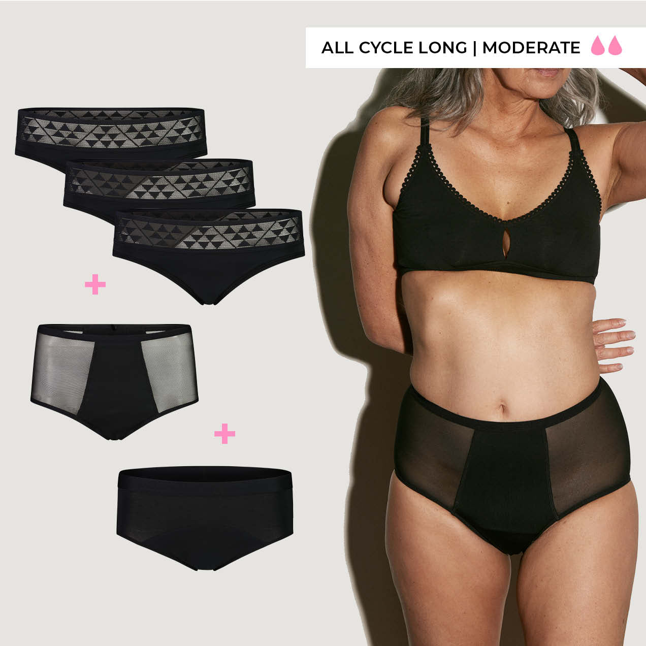 Wear any pair in this set on any day in your cycle. From day one, to your heaviest days and back again. Our Hipster Brief is an award winner and our most popular style.  The extra length in the absorbent gusset of the Organic Cotton and High Waisted Brief makes it perfect for heavier days, tummy sleepers and front bleeders.