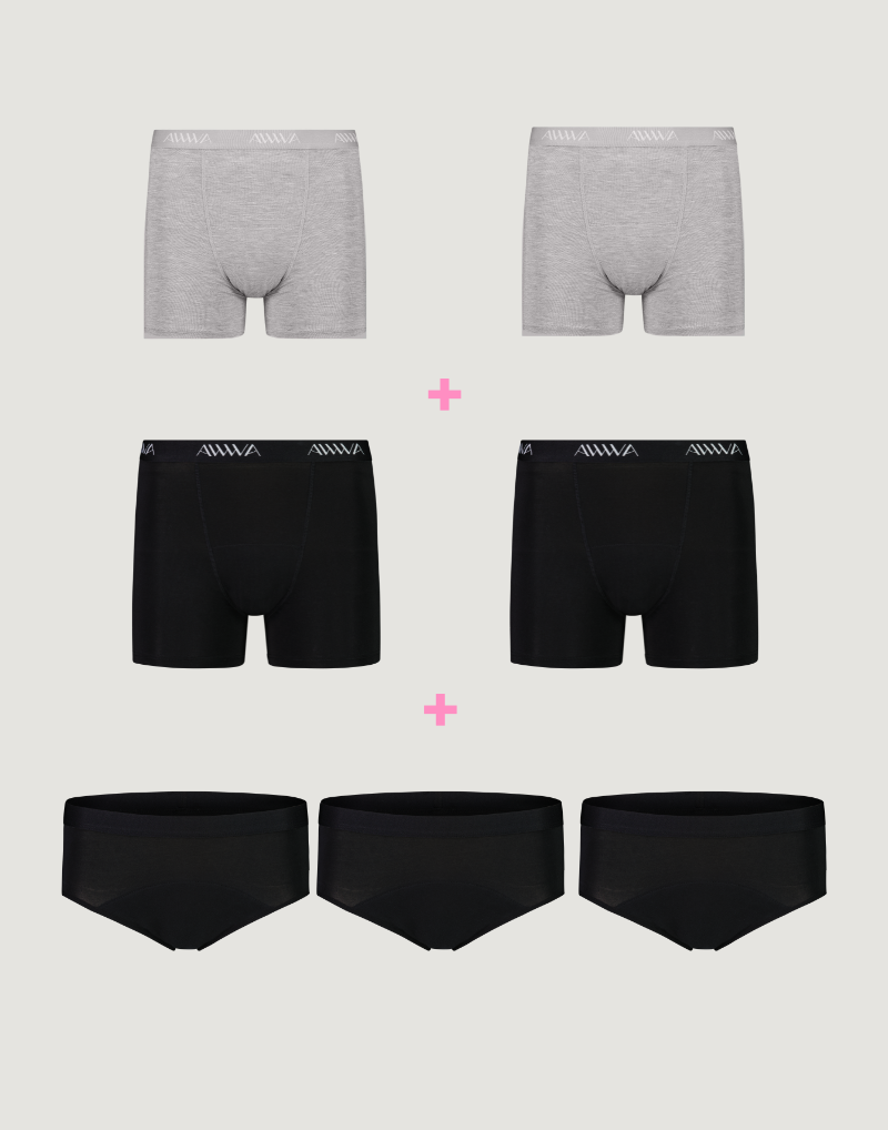 Our Comfy Period 7-Pack Set features two of our most comfortable, full coverage styles, in two absorbencies to keep you comfy and covered all cycle long. Wear the Boxer during moderate flow days and the Heavy Organic Cotton Brief during heavy flow days.